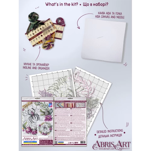 Cross-stitch kits Lace of the Invisible World (Deco Scenes) is a great cross stitch kit from Abris Art, SKU # AH-266, which you can buy right now and get delivery in a matter of days! It will give you unforgettable hours when creating a real handmade masterpiece! It is impossible to buy such a thing ready-made! High-quality materials, detailed instructions - everyone can create an unsurpassed picture, made by own hands. In fact, cross stitching is one of the most popular types of needlework (handmade). Cross-stitching often uses different types of stitches, such as ¼, ½, ¾ stitches, and the needle back stitch. The cross stitch is often combined with other stitches; it can also be of different forms. Sometimes a cross stitch is used in satin stitch embroidery (crewel embroidery), especially in its modern varieties, as well as in cross stitch on canvas (needlepoint). Cross-stitch is often combined with other types of embroidery, such as white Hardanger embroidery, black embroidery (blackwork), canvas embroidery or net embroidery. In addition, cross-stitching can be combined with beadwork with the addition of various embellishments such as sequins, pendants, small buttons and fancy threads. Purchased, embroidered and decorated with taste, Cross-stitch kits Lace of the Invisible World (Deco Scenes) embroidered and decorated with taste will bring an additional touch of warmth and comfort to your home, because its width is: 260 millimeters, and its height: 250 millimeters. Such a picture with a cross will also be a great gift for loved ones - after all, the best gift is made with your own hands! And even the final destination is not important - it is important what emotions will be received during these unsurpassed hours - when you embroider a s from Abris Art. Our author's cross-stitch kits have a stylish modern design, are completed with high-quality cotton canvas (fabric for embroidery) and threads (floss) of European production, which are conveniently placed on a cardboard organizer, as well as a cross-stitch needle, a detailed color symbolic scheme, where all types of cross stitches used and recommendations for the design of cross-stitched work, so that even a beginner can easily navigate the embroidery process. Attention to all who want to purchase a set! Some of our cross stitch patterns include a QR code that allows embroiderers using the SAGA app to access the cross stitch pattern exported to it.