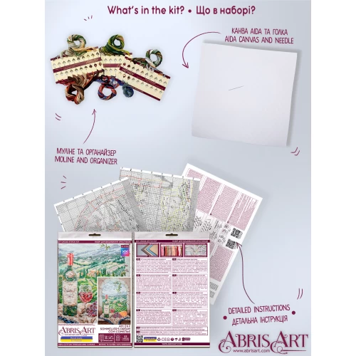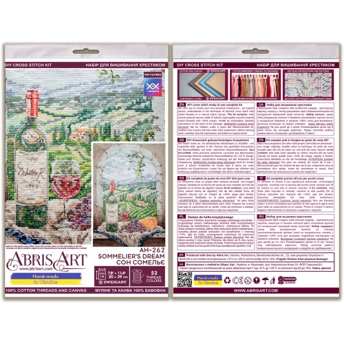 Cross-stitch kits Sommelier's Dream (Deco Scenes) is a great cross stitch kit from Abris Art, SKU # AH-262, which you can buy right now and get delivery in a matter of days! It will give you unforgettable hours when creating a real handmade masterpiece! It is impossible to buy such a thing ready-made! High-quality materials, detailed instructions - everyone can create an unsurpassed picture, made by own hands. In fact, cross stitching is one of the most popular types of needlework (handmade). Cross-stitching often uses different types of stitches, such as ¼, ½, ¾ stitches, and the needle back stitch. The cross stitch is often combined with other stitches; it can also be of different forms. Sometimes a cross stitch is used in satin stitch embroidery (crewel embroidery), especially in its modern varieties, as well as in cross stitch on canvas (needlepoint). Cross-stitch is often combined with other types of embroidery, such as white Hardanger embroidery, black embroidery (blackwork), canvas embroidery or net embroidery. In addition, cross-stitching can be combined with beadwork with the addition of various embellishments such as sequins, pendants, small buttons and fancy threads. Purchased, embroidered and decorated with taste, Cross-stitch kits Sommelier's Dream (Deco Scenes) embroidered and decorated with taste will bring an additional touch of warmth and comfort to your home, because its width is: 200 millimeters, and its height: 290 millimeters. Such a picture with a cross will also be a great gift for loved ones - after all, the best gift is made with your own hands! And even the final destination is not important - it is important what emotions will be received during these unsurpassed hours - when you embroider a s from Abris Art. Our author's cross-stitch kits have a stylish modern design, are completed with high-quality cotton canvas (fabric for embroidery) and threads (floss) of European production, which are conveniently placed on a cardboard organizer, as well as a cross-stitch needle, a detailed color symbolic scheme, where all types of cross stitches used and recommendations for the design of cross-stitched work, so that even a beginner can easily navigate the embroidery process. Attention to all who want to purchase a set! Some of our cross stitch patterns include a QR code that allows embroiderers using the SAGA app to access the cross stitch pattern exported to it.