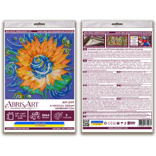 Mini Bead embroidery kit A magical dream is a great kit for beadwork (bead embroidery) from Abris Art with article AM-249 which you can buy right now and get delivery in a few days! This complete convenient set will give you an unforgettable watch when creating a real masterpiece! It is impossible to buy such a thing ready! Quality materials - natural canvas (textile) with bright high-precision printing image-scheme, the world's best Preciosa Ornela beads (Czech Republic), beaded needles from Japan and detailed instructions - everyone can create an unsurpassed picture of beads, made by hand . Beadwork has been known since ancient times. From ancient times, craftswomen admired their magnificent embroidery skills, first with pearls, and then from the middle of the 17th century with colored glass beads. Clothes were decorated with bugle, paintings were embroidered with images of different landscapes, churches, icons, etc. In our time, beadwork has become popular again. Elements of beads are used in the decoration of clothing, which gives it an original and neat look. Many styles in fashion do not do without beaded jewelry. Beads, as a material, have unlimited color possibilities, it is also available to everyone thanks to the Czech company Preciosa Ornela. Modern needlewomen not only successfully decorate clothes, but also shoes, purses, cases and handbags. Beadwork is very popular in patterns and sets depicting flowers, birds, animals and other subjects. For many women, beadwork has become a favorite hobby. This kind of creativity requires special skills, patience, dexterity and accuracy. Great mood and developed imagination play a big role. And the purchased, embroidered and tastefully decorated picture Mini Bead embroidery kit A magical dream will bring an extra touch of warmth and comfort to your home, because its width is: 150 millimeters, height: 150 millimeters, and the number of beads (beads); 2064 pcs. Such a picture of beads will also be a great gift for loved ones - because the best gift made by hand! And it doesn't even matter the ultimate destination - it's important what emotions will be received during these unsurpassed hours - when you embroider a set of beads from Abris Art. Our original schemes and kits for beadwork have a stylish modern design, complete with high-quality cotton base - canvas (embroidery taknya), the world's best beads Preciosa Ornela (Czech Republic), bead needles from Japan and detailed color symbol the scheme with a key, the instruction with the description of all types of applied seams by beads and recommendations on registration of work sewn by beads that even the beginner was easily guided in the process of embroidery. Attention everyone who wants to buy this kit for beadwork (bead embroidery)! When embroidering with beads on canvas, a scheme is used - a pattern applied to the fabric, which greatly simplifies the work process, because the canvas already has a scheme for embroidery. On the side of the diagram is the key - the number corresponds to the color of the beads and the designation on the diagram. For easy readability, the color of the symbol on the fabric may differ from the actual color of the beads in the Mini Bead embroidery kit A magical dream set. Before you start, you can stretch the patterned fabric (canvas) on a wooden frame with the help of buttons, you can also embroider on rectangular hoops or just hold the embroidery pattern from the set on your hands. If the hoops are large, the canvas can be "grown" by marking additional strips of fabric at the edges, it depends on the canvas you choose. It is better to embroider with nylon or cotton threads, you can use 100% PE, white or beige in one thread. If there is wax - wax the thread (press the thread with your fingers to the wax and stretch through it, remove excess wax by pulling the thread through your fingers). This is necessary so that the thread does not twist or get confused.