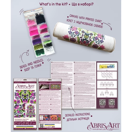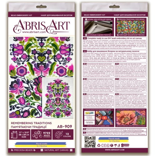 Main Bead Embroidery Kit Remembering traditions (Deco Scenes) is a great DIY kit for beadwork (bead embroidery) from Abris Art with article AB-909 which you can buy right now and get delivery in a few days! This complete convenient set will give you an unforgettable watch when creating a real masterpiece! It is impossible to buy such a thing ready! Quality materials - natural canvas (textile) with bright high-precision printing image-scheme, the world's best Preciosa Ornela beads (Czech Republic), beaded needles from Japan and detailed instructions - everyone can create an unsurpassed picture of beads, made by hand . Beadwork has been known since ancient times. From ancient times, craftswomen admired their magnificent embroidery skills, first with pearls, and then from the middle of the 17th century with colored glass beads. Clothes were decorated with bugle, paintings were embroidered with images of different landscapes, churches, icons, etc. In our time, beadwork has become popular again. Elements of beads are used in the decoration of clothing, which gives it an original and neat look. Many styles in fashion do not do without beaded jewelry. Beads, as a material, have unlimited color possibilities, it is also available to everyone thanks to the Czech company Preciosa Ornela. Modern needlewomen not only successfully decorate clothes, but also shoes, purses, cases and handbags. Beadwork is very popular in patterns and sets depicting flowers, birds, animals and other subjects. For many women, beadwork has become a favorite hobby. This kind of creativity requires special skills, patience, dexterity and accuracy. Great mood and developed imagination play a big role. And the purchased, embroidered and tastefully decorated picture Main Bead Embroidery Kit Remembering traditions (Deco Scenes) will bring an extra touch of warmth and comfort to your home, because its width is: 280 millimeters, height: 390 millimeters, and the number of beads (beads); 9722 pcs. Such a picture of beads will also be a great gift for loved ones - because the best gift made by hand! And it doesn't even matter the ultimate destination - it's important what emotions will be received during these unsurpassed hours - when you embroider a set of beads from Abris Art. Our original schemes and kits for beadwork have a stylish modern design, complete with high-quality cotton base - canvas (embroidery taknya), the world's best beads Preciosa Ornela (Czech Republic), bead needles from Japan and detailed color symbol the scheme with a key, the instruction with the description of all types of applied seams by beads and recommendations on registration of work sewn by beads that even the beginner was easily guided in the process of embroidery. Attention everyone who wants to buy this kit for beadwork (bead embroidery)! When embroidering with beads on canvas, a scheme is used - a pattern applied to the fabric, which greatly simplifies the work process, because the canvas already has a scheme for embroidery. On the side of the diagram is the key - the number corresponds to the color of the beads and the designation on the diagram. For easy readability, the color of the symbol on the fabric may differ from the actual color of the beads in the Main Bead Embroidery Kit Remembering traditions (Deco Scenes) set. Before you start, you can stretch the patterned fabric (canvas) on a wooden frame with the help of buttons, you can also embroider on rectangular hoops or just hold the embroidery pattern from the set on your hands. If the hoops are large, the canvas can be "grown" by marking additional strips of fabric at the edges, it depends on the canvas you choose. It is better to embroider with nylon or cotton threads, you can use 100% PE, white or beige in one thread. If there is wax - wax the thread (press the thread with your fingers to the wax and stretch through it, remove excess wax by pulling the thread through your fingers). This is necessary so that the thread does not twist or get confused.