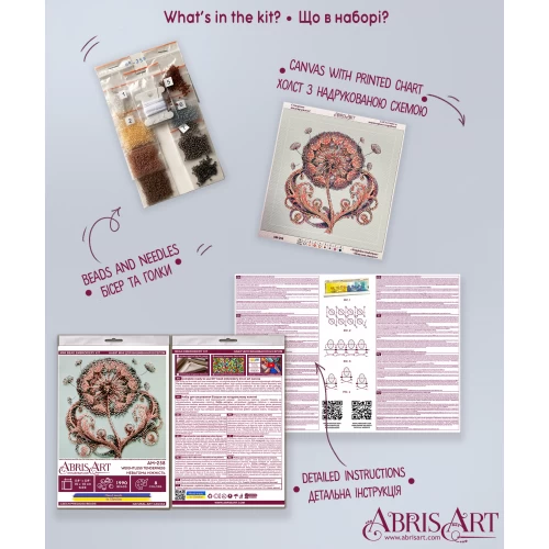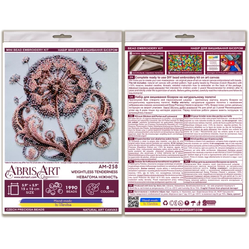 Mini Bead embroidery kit Weightless tenderness is a great kit for beadwork (bead embroidery) from Abris Art with article AM-258 which you can buy right now and get delivery in a few days! This complete convenient set will give you an unforgettable watch when creating a real masterpiece! It is impossible to buy such a thing ready! Quality materials - natural canvas (textile) with bright high-precision printing image-scheme, the world's best Preciosa Ornela beads (Czech Republic), beaded needles from Japan and detailed instructions - everyone can create an unsurpassed picture of beads, made by hand . Beadwork has been known since ancient times. From ancient times, craftswomen admired their magnificent embroidery skills, first with pearls, and then from the middle of the 17th century with colored glass beads. Clothes were decorated with bugle, paintings were embroidered with images of different landscapes, churches, icons, etc. In our time, beadwork has become popular again. Elements of beads are used in the decoration of clothing, which gives it an original and neat look. Many styles in fashion do not do without beaded jewelry. Beads, as a material, have unlimited color possibilities, it is also available to everyone thanks to the Czech company Preciosa Ornela. Modern needlewomen not only successfully decorate clothes, but also shoes, purses, cases and handbags. Beadwork is very popular in patterns and sets depicting flowers, birds, animals and other subjects. For many women, beadwork has become a favorite hobby. This kind of creativity requires special skills, patience, dexterity and accuracy. Great mood and developed imagination play a big role. And the purchased, embroidered and tastefully decorated picture Mini Bead embroidery kit Weightless tenderness will bring an extra touch of warmth and comfort to your home, because its width is: 150 millimeters, height: 150 millimeters, and the number of beads (beads); 1990 pcs. Such a picture of beads will also be a great gift for loved ones - because the best gift made by hand! And it doesn't even matter the ultimate destination - it's important what emotions will be received during these unsurpassed hours - when you embroider a set of beads from Abris Art. Our original schemes and kits for beadwork have a stylish modern design, complete with high-quality cotton base - canvas (embroidery taknya), the world's best beads Preciosa Ornela (Czech Republic), bead needles from Japan and detailed color symbol the scheme with a key, the instruction with the description of all types of applied seams by beads and recommendations on registration of work sewn by beads that even the beginner was easily guided in the process of embroidery. Attention everyone who wants to buy this kit for beadwork (bead embroidery)! When embroidering with beads on canvas, a scheme is used - a pattern applied to the fabric, which greatly simplifies the work process, because the canvas already has a scheme for embroidery. On the side of the diagram is the key - the number corresponds to the color of the beads and the designation on the diagram. For easy readability, the color of the symbol on the fabric may differ from the actual color of the beads in the Mini Bead embroidery kit Weightless tenderness set. Before you start, you can stretch the patterned fabric (canvas) on a wooden frame with the help of buttons, you can also embroider on rectangular hoops or just hold the embroidery pattern from the set on your hands. If the hoops are large, the canvas can be "grown" by marking additional strips of fabric at the edges, it depends on the canvas you choose. It is better to embroider with nylon or cotton threads, you can use 100% PE, white or beige in one thread. If there is wax - wax the thread (press the thread with your fingers to the wax and stretch through it, remove excess wax by pulling the thread through your fingers). This is necessary so that the thread does not twist or get confused.